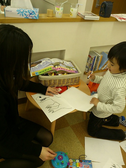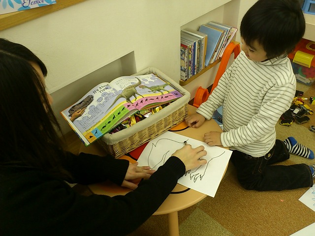 おねぇちゃんと一緒に恐竜を書いているところを見に行くと