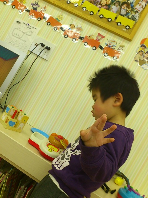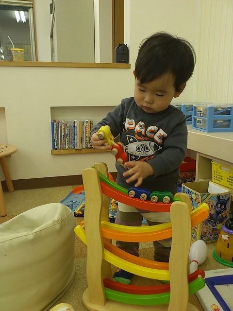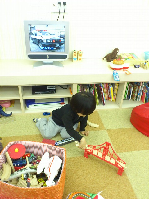 ゆうきくんは電車の線路を組み立てて遊んでました