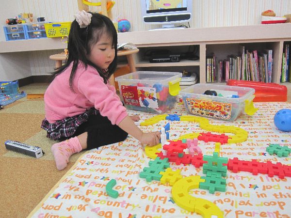 ブロックで、車が通る道を作ったり、おままごとをしたり