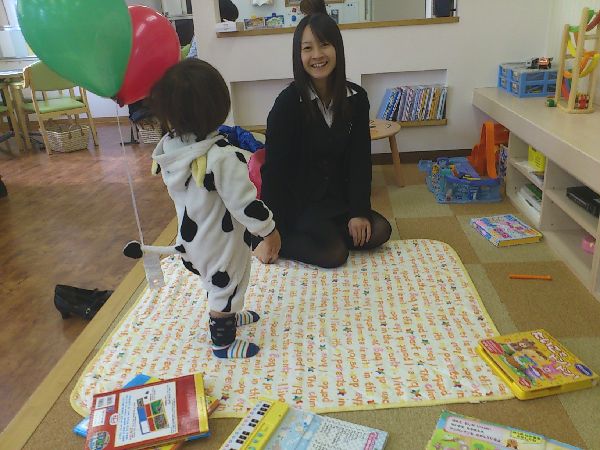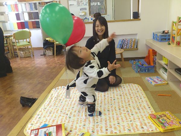 牛柄のかわいい服を来たはくとくんは風船に夢中