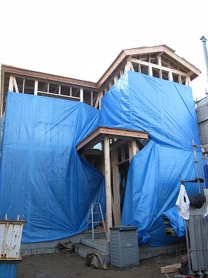 雨が降っても大丈夫なようにブルーシートで囲み養生完了