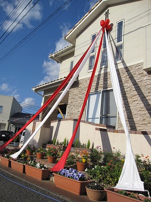 モデルハウスに飾ってある赤と白のリボンを