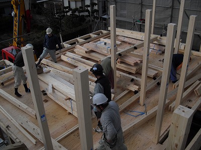 寒さに負けず、大工さんたちのチームワークはバッチリ